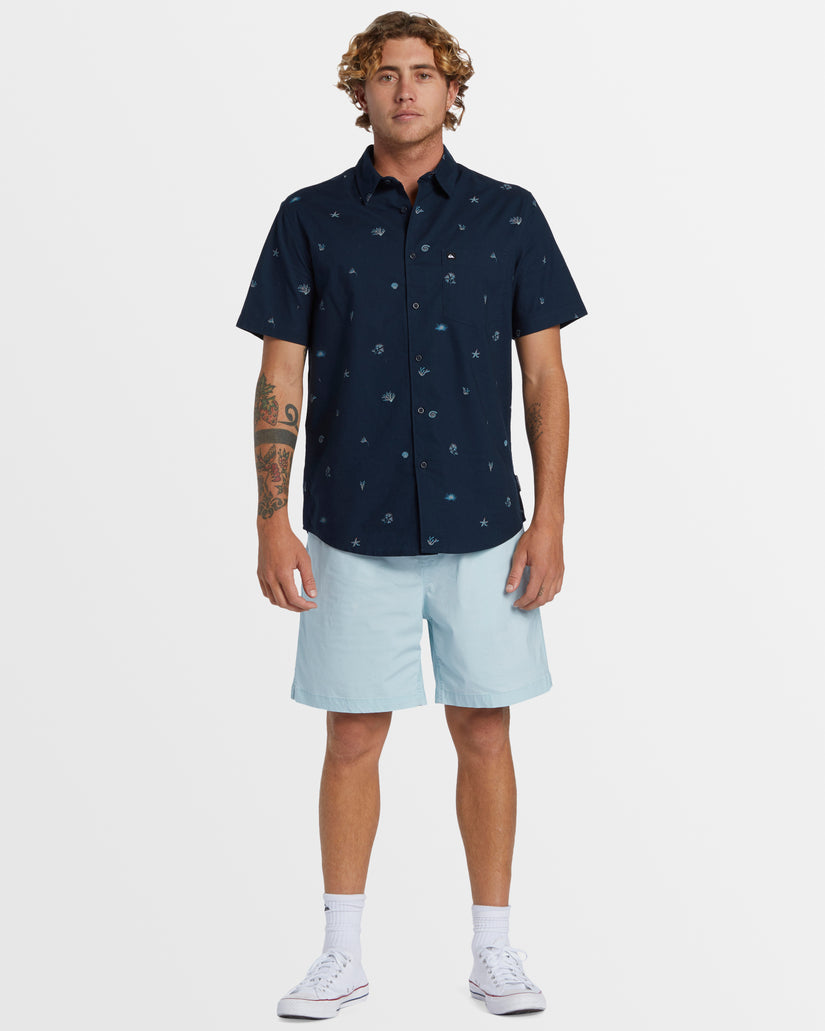 Experience comfort and style with Quiksilver's Apero Short-Sleeve Woven Shirt, featuring a regular fit, classic collar neck, short sleeves, button closure, single chest pocket, and scalloped hem. Crafted from cotton plain weave fabric and garment washed for softness.