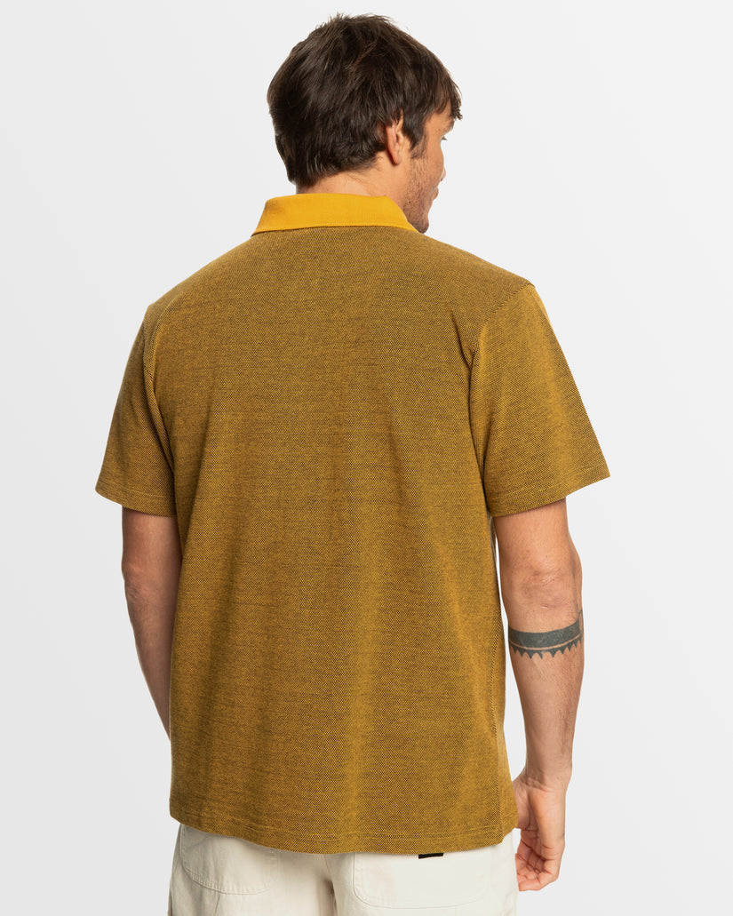 Experience unbeatable comfort and style with Quiksilver's DNA Polo Crew Neck Top, crafted from organic cotton fabric in a regular fit. Featuring short sleeves, a collar neck with button closure, and branding details including an embroidered patch on the left chest and a flag label at the left side seam. Featured here in the Mustard Dna Polo colorway.