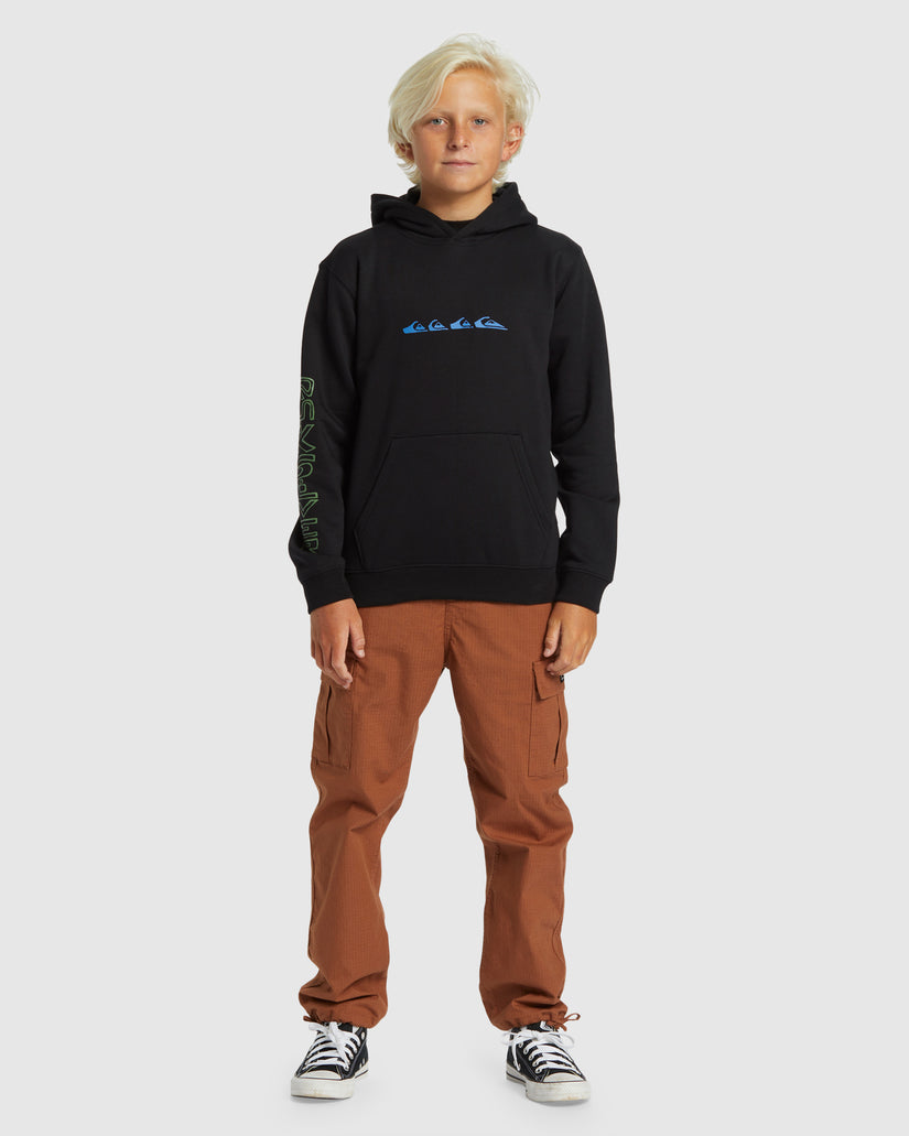 Stay geared up for any occasion, and every adventure with this Youth Boy's graphic hoodie. Made in super soft blended cotton, it features a kangaroo pouch pocket, ribbed cuff details, and a fresh range of colors and graphics giving it that signature Quiksilver style.