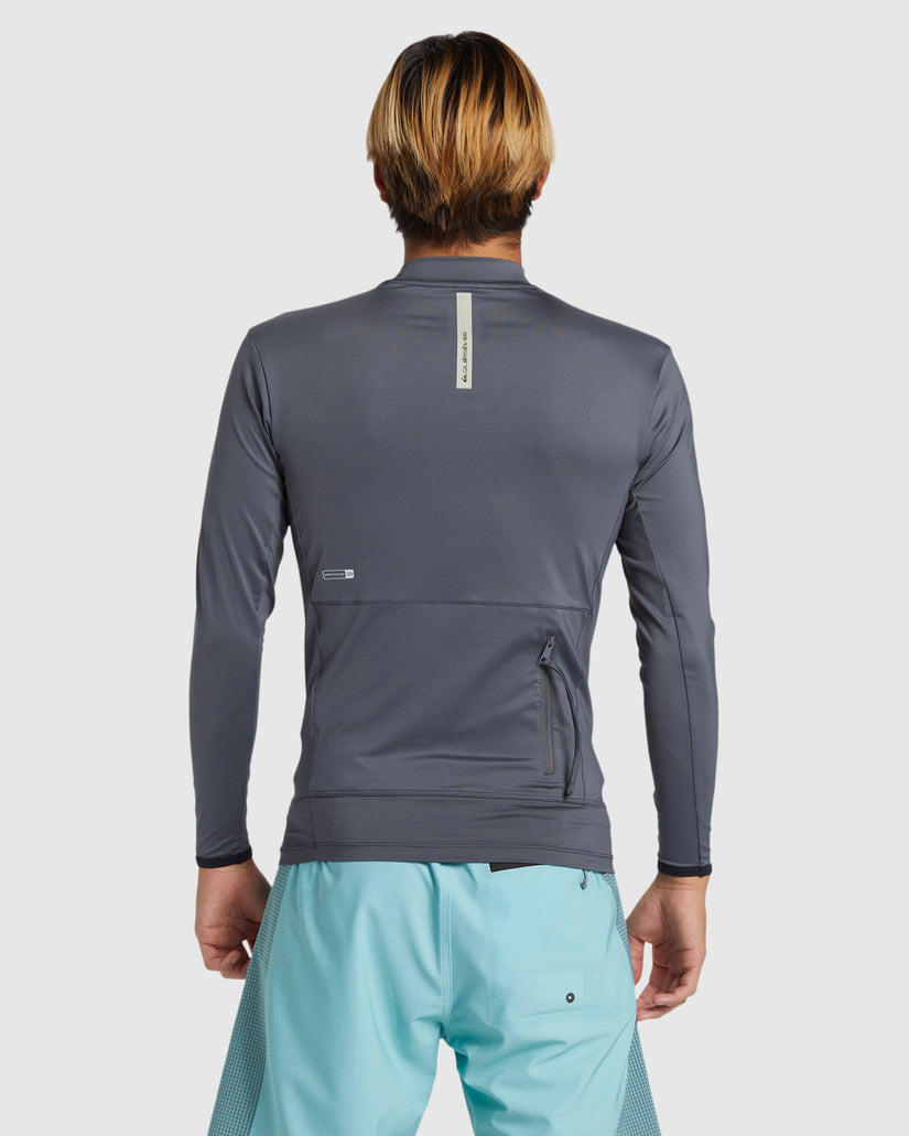 Experience ultimate performance with Quiksilver's Highline Long-Sleeve Rashguard, crafted from a recycled polyester-elastane blend fabric with SWR-Shield technology for moisture-wicking properties and superior sun protection. The snug fit and mock neck limit water entry and maximize comfort. Featured here in the Iron Gate colorway.