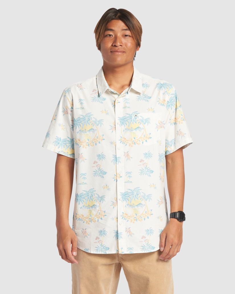 Step into holiday mode with Quiksilver's Palm Spritz Short Sleeve Woven Shirt. Crafted from a cotton-viscose blend poplin fabric, this shirt is your ticket to comfort and style. The regular fit, collar neck, short sleeves, and button front closure are all about embracing the game and looking good while doing it.