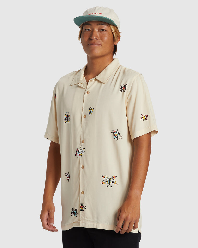Experience the perfect blend of style and comfort with Quiksilver's Pool Party Short-Sleeve Woven Shirt. Crafted from a lightweight, breathable viscose twill fabric, this regular-fit shirt features an open collar neck, short sleeves, a single chest pocket, button closure, and scalloped hemline.