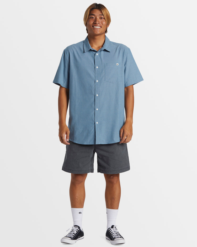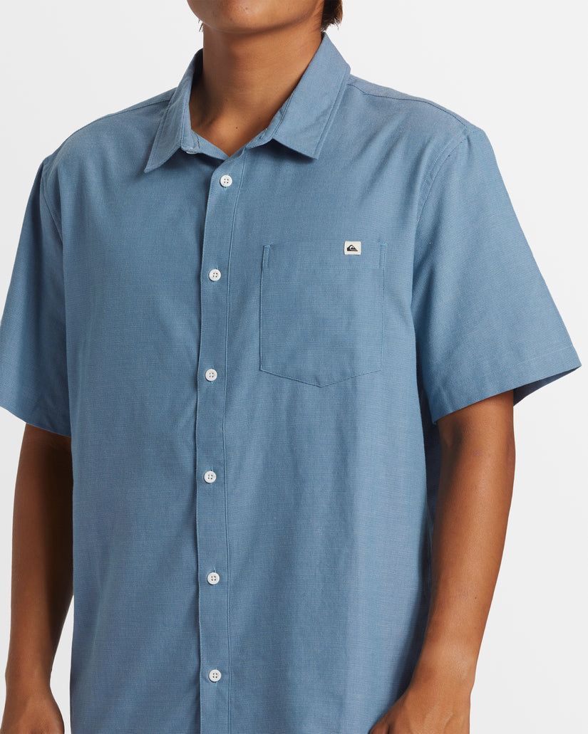 Experience ultimate comfort with the Shoreline Short-Sleeve Woven Shirt from Quiksilver. Crafted from a blended cotton weave fabric, this shirt features a regular fit, classic collar neck, short sleeves, single chest pocket, button closure, and scalloped hem. Branding is supplied through the Quiksilver woven label on the chest pocket and side seam. Featured here in the Blue Shadow colorway.
