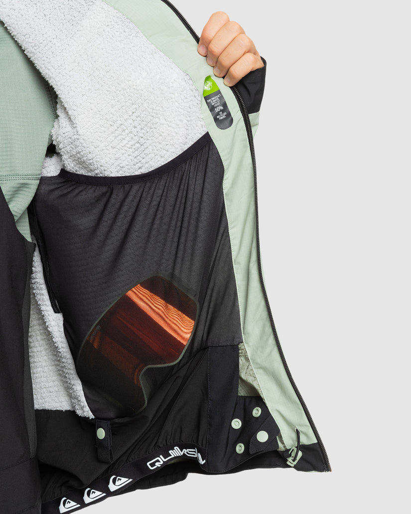 Stay dry and comfortable in this Ultralight Quiksilver snow jacket. Crafted from partially recycled materials, it's waterproof, breathable and maintains warmth while staying extremely lightweight. The modern, slimmer fit gives you the mobility you need, while the helmet-compatible hood and powder skirt keep the elements out.